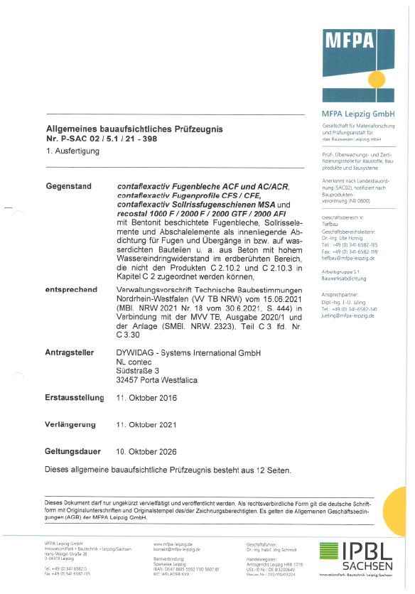 RECOSTAL® 1000 F activ ist ein Abschalelement mit integriertem bentonitbeschichtetem contaflexactiv Fugenblech. RECOSTAL® 1000 F activ wird zur Herstellung und Abdichtung von Arbeitsfugen von Sohlplatten, Stahlbetonwänden und Decken in WU-Konstruktionen verwendet.